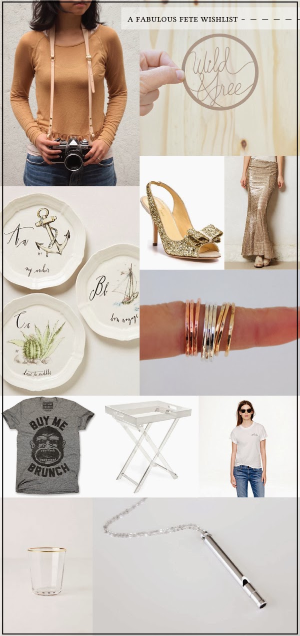 camera strap - i'm loving this choice, so much more chic than that plain old one that comes with the camera. and so pretty it looks more like part of your outfit than anything else! // paper cut - i would absolutely love to have different designs set out at place settings for an all girl dinner party // kate spade bow heels - i mean, who doesn't need these for the holidays? // sequin skirt - my favorite style is a little bit of sparkle, and a lot of simple comfiness. i would pair this skirt with either one of the tee's above // app plates - if i could get my calligraphy on a set of dessert/app plates i would! but i'll settle for these now:) // stacking rings - currently obsessed with these, and i'm loving the mixed metals // buy me brunch tee - brunch is one of my favorite meals (hello mimosas), so this tee is perfection // acrylic tray - would totally sub this in for a bar! // oh la la tee - a girl can never have enough white tees, especially ones embellished with fabulous quotes // gold rimmed glass - the ultimate glass for your holiday bar // whistle necklace - i love the simplicity of this necklace, and any long pendants for that matter!